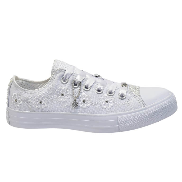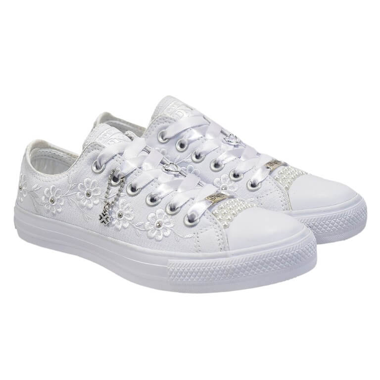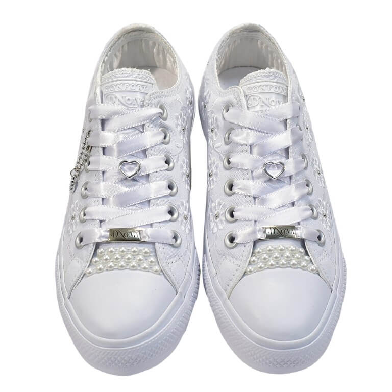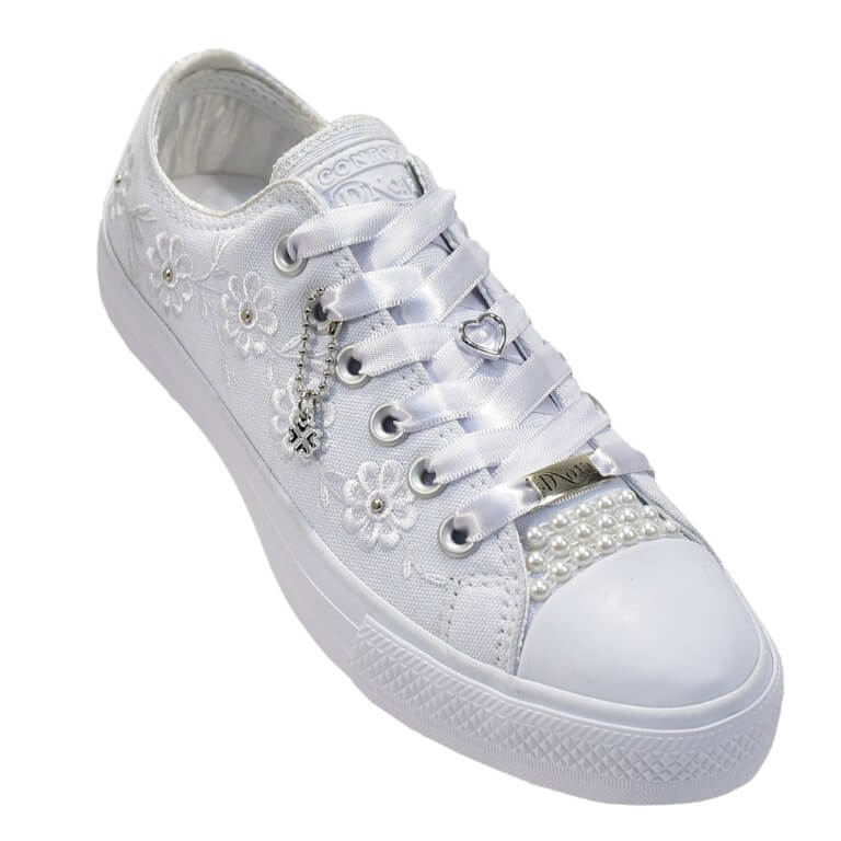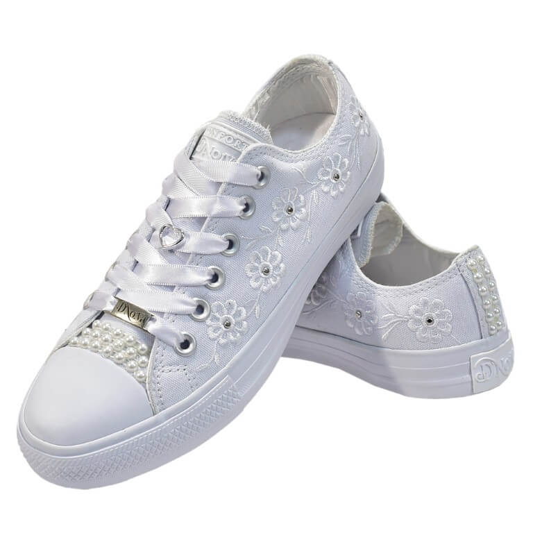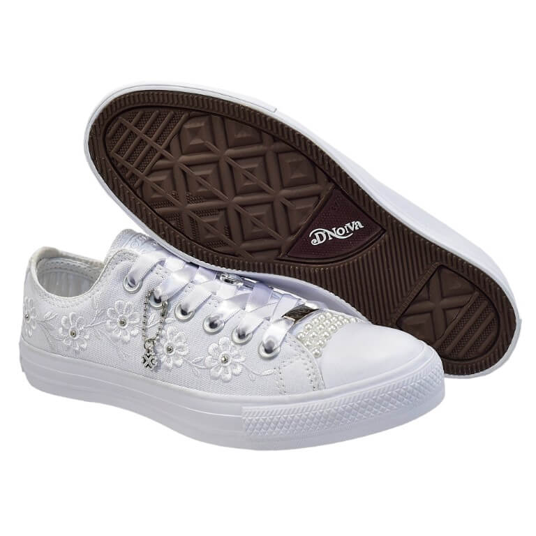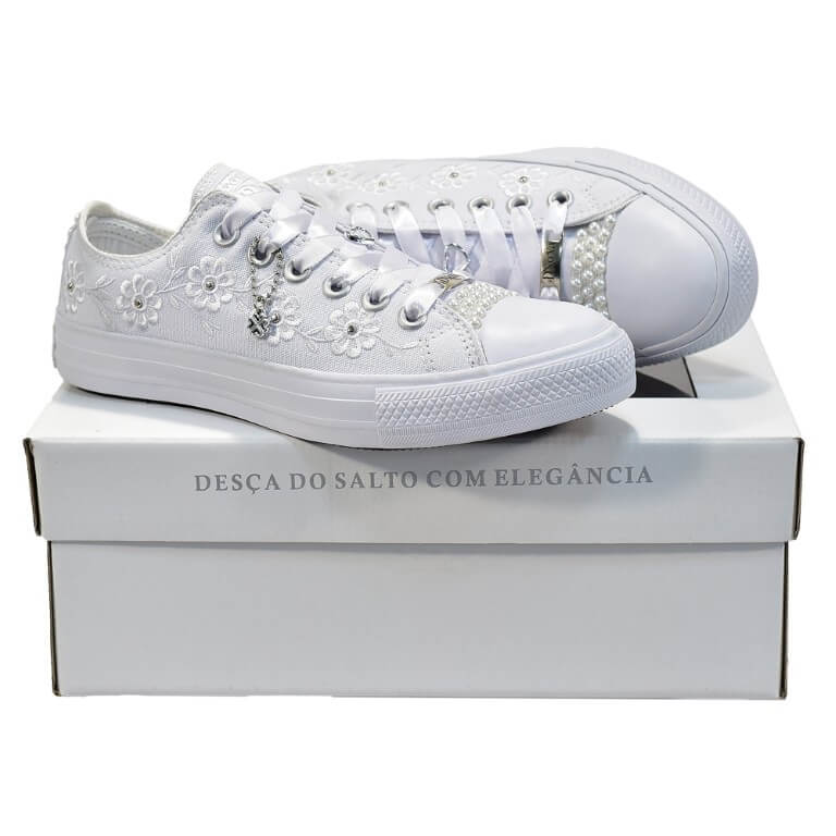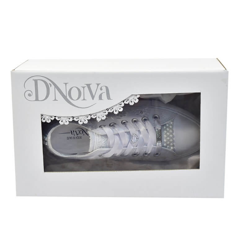 Cada par do Tênis D’Noiva é feito de maneira exclusiva, sob encomenda, com gravação dos nomes dos noivos e a data do casamento.